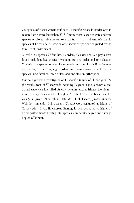 ? 237 species of insects were identified in 11 specific islands located in Shinan region from May to September, 2018. Among them, 3 species were endemic species of Korea, 28 species were control list of indigenous/endemic species of Korea and 69 species were specified species designated by the Ministry of Environment. ? A total of 43 species, 28 families, 13 orders, 6 classes and four phyla were f...