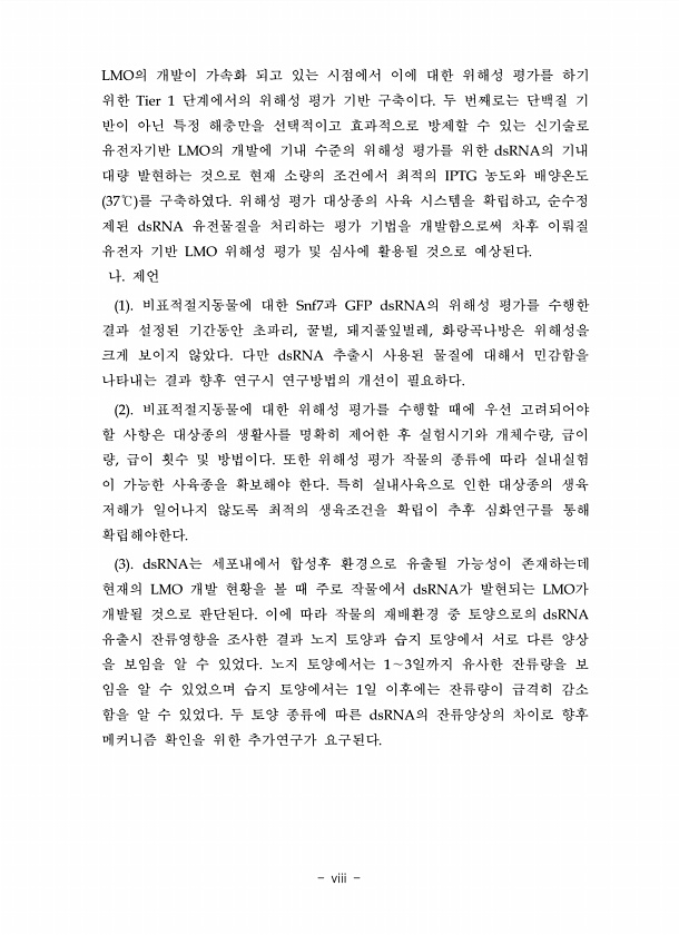 LMO의 개발이 가속화 되고 있는 시점에서 이에 대한 위해성 평가를 하기 위한 Tier 1 단계에서의 위해성 평가 기반 구축이다. 두 번째로는 단백질 기 반이 아닌 특정 해충만을 선택적이고 효과적으로 방제할 수 있는 신기술로 유전자기반 LMO의 개발에 기내 수준의 위해성 평가를 위한 dsRNA의 기내 대량 발현하는 것으로 현재 소량의 조건에서 최적의 IPTG 농도와 배양온도 37℃ 를 구축하였다. 위해성 평가 대상종의 사육 시스템을 확립하고, 순수정 제된 dsRNA 유전물질을 처리하는 평가 기법을 개발함으로써 차후 이뤄질 유전자 기반 LMO 위해성 평가 및 심사에 활용될 것으로 예상된다. 나. 제언 1 비표적절지동물에 대한 Snf7과 GFP dsRNA의 위해성 평가를 수행한 결과 설정된 기간동안 초파리, 꿀...