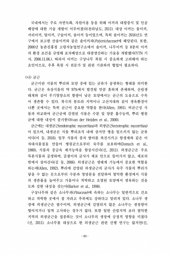 국내에서는 주로 사면녹화, 자원이용 등을 위해 이끼의 대량증식 및 인공 배양에 대한 기술 개발이 이루어졌다 전라남도, 2011 대상 이끼는 물이끼, 서리이끼, 털이끼, 구슬이끼, 솔이끼 등이었으며, 특히 솔이끼는 2016년도 연 구에서 보고한 산솔이끼와 같은 솔이끼과 Polytrichaceae 에 해당된다. 또한, 2006년 농촌진흥청 고령지농업연구소에서 솔이끼, 나무이끼 등 8종의 이끼 의 환경 조건을 규명해 포자배양으로 대량생산하는 기술을 개발했다 YTN 기 사, 2006.11.06. 따라서 이끼는 구상나무 복원 시 중요하게 고려해야 하는 요인이므로, 추후 복원 시 전문가 및 관련 기관와의 협업이 필요하다. 나 균근 균근이란 식물의 뿌리와 토양 중에 있는 균류가 공생하는 형태를 의미한 다. 균근은 육상식...