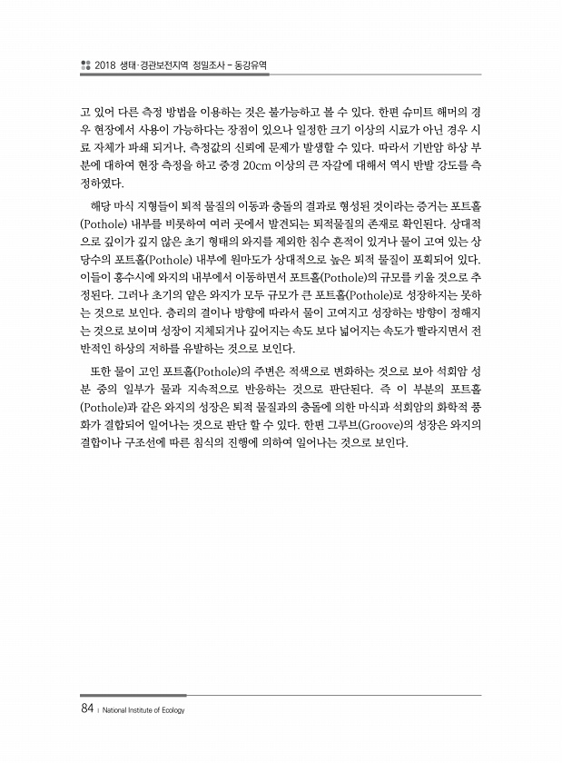 2018 생태·경관보전지역 정밀조사 동강유역 84 ? National Institute of Ecology 고 있어 다른 측정 방법을 이용하는 것은 불가능하고 볼 수 있다. 한편 슈미트 해머의 경 우 현장에서 사용이 가능하다는 장점이 있으나 일정한 크기 이상의 시료가 아닌 경우 시 료 자체가 파쇄 되거나, 측정값의 신뢰에 문제가 발생할 수 있다. 따라서 기반암 하상 부 분에 대하여 현장 측정을 하고 중경 20cm 이상의 큰 자갈에 대해서 역시 반발 강도를 측 정하였다. 해당 마식 지형들이 퇴적 물질의 이동과 충돌의 결과로 형성된 것이라는 증거는 포트홀 Pothole 내부를 비롯하여 여러 곳에서 발견되는 퇴적물질의 존재로 확인된다. 상대적 으로 깊이가 깊지 않은 초기 형태의 와지를 제외한 침수 흔적이 있거나 ...
