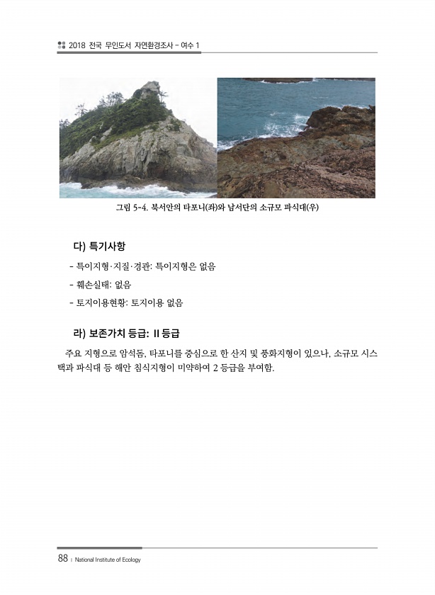 2018 전국 무인도서 자연환경조사 여수 1 88 ? National Institute of Ecology 그림 5-4. 북서안의 타포니 좌 와 남서단의 소규모 파식대 우 특이지형·지질·경관특이지형은 없음 훼손실태없음 토지이용현황토지이용 없음 주요 지형으로 암석돔, 타포니를 중심으로 한 산지 및 풍화지형이 있으나, 소규모 시스 택과 파식대 등 해안 침식지형이 미약하여 2 등급을부여함.