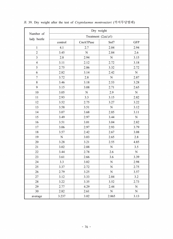 76 39. Dry weight after the test of Cryptolaemus montrouzieri Number of lady beetle Dry weight Treatment 2㎍/㎕ control CmATPase Snf7 GFP 1 4.1 2.7 2.04 2.94 2 3.45 N 2.84 2.6 3 2.8 2.94 N 3.15 4 3.11 2.12 2.72 3.18 5 2.75 2.86 3.32 2.72 6 2.82 3.14 2.42 N 7 3.72 2.8 N 2.87 8 3.46 3.18 2.53 3.28 9 3.15 3.08 2.71 2.65 10 3.05 N 2.9 N 11 2.93 3.3 3.15 2.82 12 3.52 2.75 3.27 3.22 13 3.58 3.51 N 3.12 14...