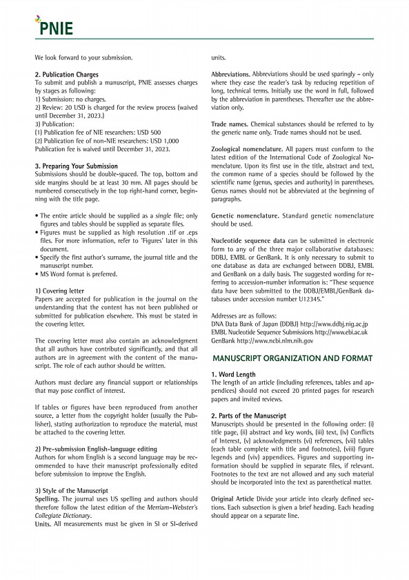 We look forward to your submission. 2. Publication Charges To submit and publish a manuscript, PNIE assesses charges by stages as following1 Submissionno charges. 2 Review20 USD is charged for the review process waived until December 31, 2023. 3 Publication1 Publication fee of NIE researchersUSD 500 2 Publication fee of non-NIE researchersUSD 1,000 Publication fee is waived until December 31, 2023...