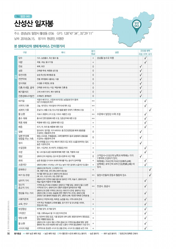 No. 밀양- 본 생태자산의 생태계서비스 간이평가지 구분 예시 평가 등급 설명 규모별 혜택 지점 지역 국가 공급 담수 식수, 농업용수, 축산 용수 등 + 상남뜰 농수로 이용 √ 식량 곡물, 과실, 물고기 등 + √ 연료 화목, 토탄 0 √ 섬유 건축용 목재, 의류용 섬유 등 0 √ 유전자원 농업·축산업 희귀품종 등 0 √ 천연약재 전통 의약품에 사용되는 식물 0 √ 장식재료 수집용 조개껍질, 꽃 등 0 √ 진흙,미네랄, 골재 건축용 모래 또는 자갈, 벽돌재료 진흙 등 0 √ 폐기물처리 고체 쓰레기 하치, 폐수 방류 등 0 √ 친환경에너지발전 조력발전, 풍력발전 0 √ 조절 대기질 자동차 배기가스, 산업체 대기오염, 농업발생 먼지 등의 대기 미세물질의 제거 ++ √ 지역적 기후 그늘, 대기온도 저하 등의 지역...