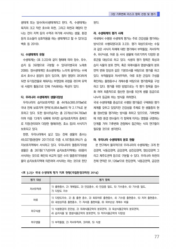 3장 기후변화 리스크 항목 선정 및 평가 77 생태계 또는 담수 육수 생태계라고 한다. 즉, 수생태계는 육지의 크고 작은 호수와 하천, 그리고 하천과 해양이 만 나는 전이 지역 등의 수역과 여기에 서식하는 생물, 환경 등의 요소들이 상호작용을 하는 생태계라고 할 수 있다 김 백호 등 2019 나. 수생태계의 유형 수생태계는 표 3.23 와 같이 형태에 따라 정수, 유수, 습지 등 3유형으로 구분할 수 있다 이병국과 노태호 2006 정수생태계인 호소생태계는 느리게 움직이는 수체 로서 호수나 웅덩이 등이 있으며, 점차 영양이 과다하게 되면 유기침전물로 채워지는 부영양화 과정을 겪으며 유역 내 사람의 활동으로 인해 가속화되는 특성이 있다. 다. 우리나라 수생태계의 생물다양성 우리나라의 습지보호지역은 총 44개소 ...