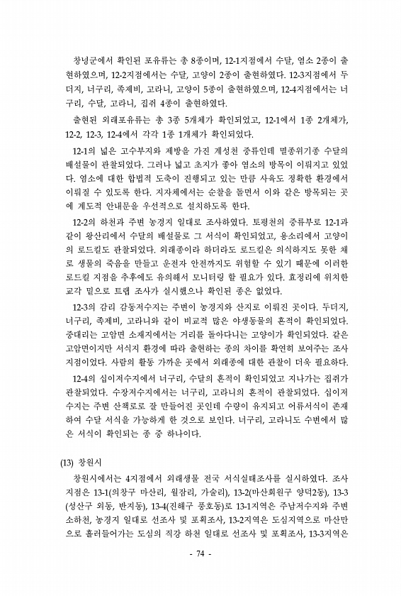 창녕군에서 확인된 포유류는 총 8종이며, 12-1지점에서 수달, 염소 2종이 출 현하였으며, 12-2지점에서는 수달, 고양이 2종이 출현하였다. 12-3지점에서 두 더지, 너구리, 족제비, 고라니, 고양이 5종이 출현하였으며, 12-4지점에서는 너 구리, 수달, 고라니, 집쥐 4종이 출현하였다. 출현된 외래포유류는 총 3종 5개체가 확인되었고, 12-1에서 1종 2개체가, 12-2, 12-3, 12-4에서 각각 1종 1개체가 확인되었다. 12-1의 넓은 고수부지와 제방을 가진 계성천 중류인데 멸종위기종 수달의 배설물이 관찰되었다. 그러나 넓고 초지가 좋아 염소의 방목이 이뤄지고 있었 다. 염소에 대한 합법적 도축이 진행되고 있는 만큼 사육도 정확한 환경에서 이뤄질 수 있도록 한다. 지자체에서는 순찰을 돌면서...