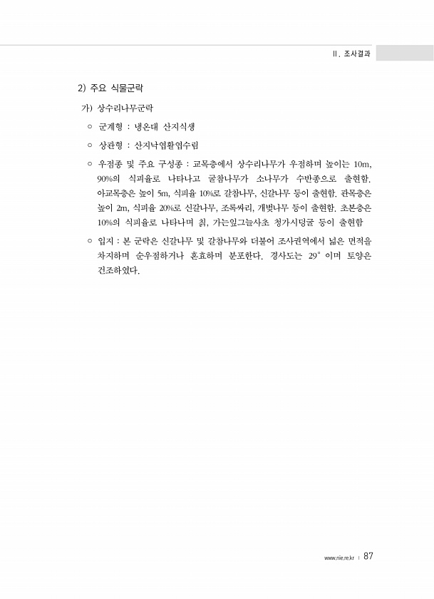 Ⅱ. 조사결과 www.nie.re.kr ? 87 2 주요 식물군락 가 상수리나무군락 ? 군계형 냉온대 산지식생 ? 상관형 산지낙엽활엽수림 ? 우점종 및 주요 구성종 교목층에서 상수리나무가 우점하며 높이는 10m, 90%의 식피율로 나타나고 굴참나무가 소나무가 수반종으로 출현함. 아교목층은 높이 5m, 식피율 10%로 갈참나무, 신갈나무 등이 출현함. 관목층은 높이 2m, 식피율 20%로 신갈나무, 조록싸리, 개벚나무 등이 출현함. 초본층은 10%의 식피율로 나타나며 칡, 가는잎그늘사초 청가시덩굴 등이 출현함 ? 입지 본 군락은 신갈나무 및 갈참나무와 더불어 조사권역에서 넓은 면적을 차지하며 순우점하거나 혼효하며 분포한다. 경사도는 29°이며 토양은건조하였다.