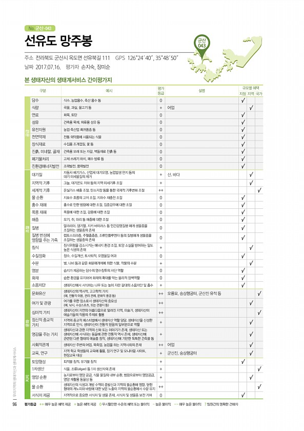 No. 군산- 군산 043 본 생태자산의 생태계서비스 간이평가지 구분 예시 평가 등급 설명 규모별 혜택 지점 지역 국가 공급 담수 식수, 농업용수, 축산 용수 등 0 √ 식량 곡물, 과실, 물고기 등 + 어업 √ 연료 화목, 토탄 0 √ 섬유 건축용 목재, 의류용 섬유 등 0 √ 유전자원 농업·축산업 희귀품종 등 0 √ 천연약재 전통 의약품에 사용되는 식물 0 √ 장식재료 수집용 조개껍질, 꽃 등 0 √ 진흙, 미네랄, 골재 건축용 모래 또는 자갈, 벽돌재료 진흙 등 0 √ 폐기물처리 고체 쓰레기 하치, 폐수 방류 등 0 √ 친환경에너지발전 조력발전, 풍력발전 0 √ 조절 대기질 자동차 배기가스, 산업체 대기오염, 농업발생 먼지 등의 대기 미세물질의 제거 + 산, 바다 √ 지역적 기후 그늘, 대기온도 저하 ...