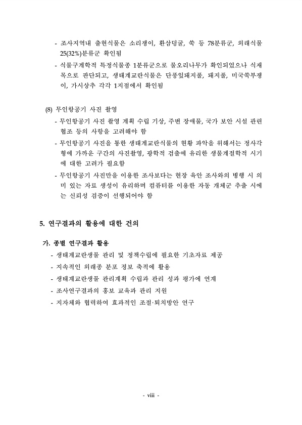 viii 조사지역내 출현식물은 소리쟁이, 환삼덩굴, 쑥 등 78분류군, 외래식물 25 32% 분류군 확인됨 식물구계학적 특정식물종 1분류군으로 물오리나무가 확인되었으나 식재 목으로 판단되고, 생태계교란식물은 단풍잎돼지풀, 돼지풀, 미국쑥부쟁 이, 가시상추 각각 1지점에서 확인됨 8 무인항공기 사진 촬영 무인항공기 사진 촬영 계획 수립 기상, 주변 장애물, 국가 보안 시설 관련 협조 등의 사항을 고려해야 함 무인항공기 사진을 통한 생태계교란식물의 현황 파악을 위해서는 정사각 형에 가까운 구간의 사진촬영, 광학적 검출에 유리한 생물계절학적 시기 에 대한 고려가 필요함 무인항공기 사진만을 이용한 조사보다는 현장 육안 조사와의 병행 시 의 미 있는 자료 생성이 유리하며 컴퓨터를 이용한 자동 개체군 추출 시에 는 신...