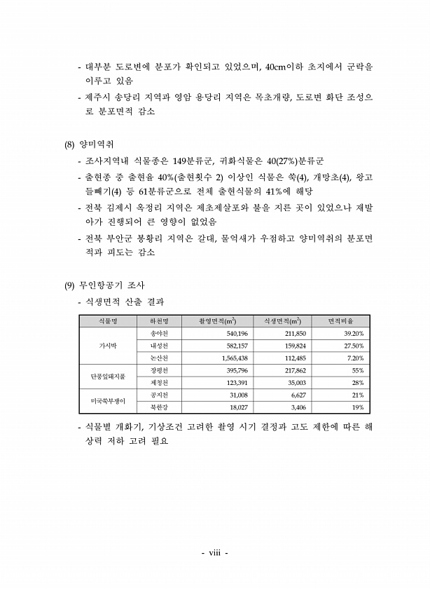 viii 대부분 도로변에 분포가 확인되고 있었으며, 40cm이하 초지에서 군락을 이루고 있음 제주시 송당리 지역과 영암 용당리 지역은 목초개량, 도로변 화단 조성으 로 분포면적 감소 8 양미역취 조사지역내 식물종은 149분류군, 귀화식물은 40 27% 분류군 출현종 중 출현율 40% 출현횟수 2 이상인 식물은 쑥 4 , 개망초 4 , 왕고 들빼기 4 등 61분류군으로 전체 출현식물의 41%에 해당 전북 김제시 옥정리 지역은 제초제살포와 불을 지른 곳이 있었으나 재발 아가 진행되어 큰 영향이 없었음 전북 부안군 봉황리 지역은 갈대, 물억새가 우점하고 양미역취의 분포면 적과 피도는 감소 9 무인항공기 조사 식생면적 산출 결과 식물명 하천명 촬영면적 m2 식생면적 m2 면적비율 가시박 송야천 540,196 211...