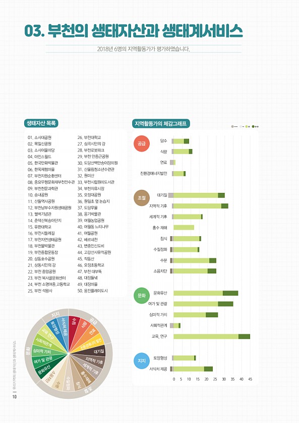 담수 서식처 제공 토양형성 교육 연구 사회적관계 심미적 가치 여가 및 관광 문화유산 소음차단 수분 수질정화 침식 홍수재해 세계적 기후 지역적 기후 대기질 친환경에너지 발전 연료 식량 공급 조절 문화 지지 지역활동가의 체감그래프 0 5 10 15 20 25 30 35 40 45 담수 식량 연료 친환경에너지발전 대기질 지역적 기후 세계적 기후 홍수 재해 침식 수질정화 수분 소음차단 문화유산 여가 및 관광 심미적 가치 사회적관계 교육, 연구 토양형성 서식처 제공 ●-- ●- ●+ ●++ 문화 공급 조절 지지 03. 부천의 생태자산과 생태계서비스 2018년 6명의 지역활동가가 평가하였습니다. 01. 소사대공원 02. 목일신공원 03. 소사어울마당 04. 아인스월드 05. 한국만화박물관 06. 한옥체험마을 07. 부...