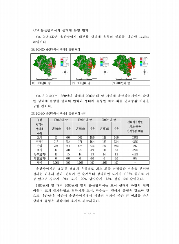 66 카 울산광역시의 생태계 유형 변화 표 2-2-43 은 울산광역시 대분류 생태계 유형의 변화를 나타낸 그리드 파일이다. a 1980년대 말 b 1990년대 말 c 2000년대 말 표 2-2-43 울산광역시 생태계 유형 변화 표 2-2-44 는 1980년대 말에서 2000년대 말 사이에 울산광역시에서 발생 한 생태계 유형별 면적의 변화와 생태계 유형별 최초-최종 면적증감 비율을 구한 것이다. 부산 광역시 생태계 유형 1980년대 말 1990년대 말 2000년대 말 생태계유형별 최초-최종 면적 ㎢ 비율 면적 ㎢ 비율 면적 ㎢ 비율 면적증감 비율 도시 63 6.0 106 10.0 149 14.0 137% 경작지 217 20.4 174 16.4 132 12.4 -39% 산림 723 68.1 673 63.4 73...