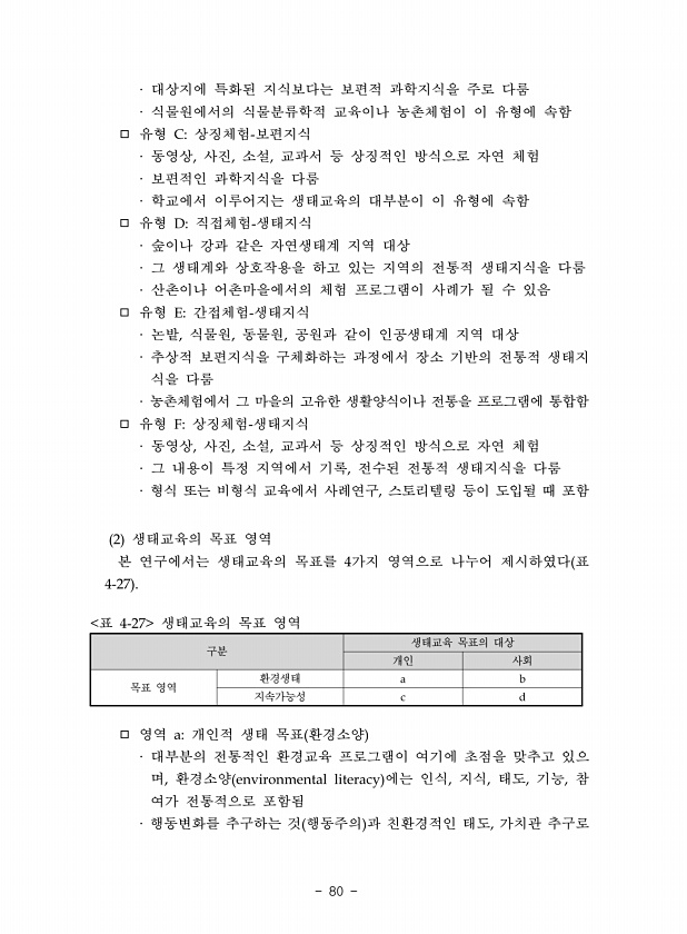 80 대상지에 특화된 지식보다는 보편적 과학지식을 주로 다룸 식물원에서의 식물분류학적 교육이나 농촌체험이 이 유형에 속함 유형 상징체험 보편지식 동영상 사진 소설 교과서 등 상징적인 방식으로 자연 체험 보편적인 과학지식을 다룸 학교에서 이루어지는 생태교육의 대부분이 이 유형에 속함 유형 직접체험 생태지식 숲이나 강과 같은 자연생태계 지역 대상 그 생태계와 상호작용을 하고 있는 지역의 전통적 생태지식을 다룸 산촌이나 어촌마을에서의 체험 프로그램이 사례가 될 수 있음 유형 간접체험 생태지식 논밭 식물원 동물원 공원과 같이 인공생태계 지역 대상 추상적 보편지식을 구체화하는 과정에서 장소 기반의 전통적 생태지 식을 다룸 농촌체험에서 그 마을의 고유한 생활양식이나 전통을 프로그램에 통합함 유형 상징체험 생태지식 동영...