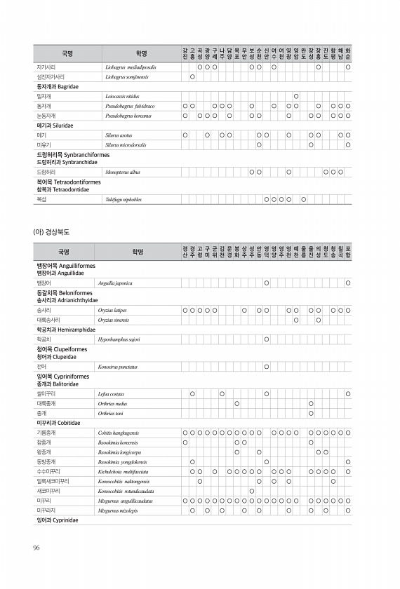 96 자가사리 Liobagrus mediadiposalis ○ ○ ○ ○ ○ ○ ○ ○ 섬진자가사리 Liobagrus somjinensis ○ 동자개과 Bagridae 밀자개 Leiocassis nitidus ○ 동자개 Pseudobagrus fulvidraco ○ ○ ○ ○ ○ ○ ○ ○ ○ ○ ○ ○ ○ 눈동자개 Pseudobagrus koreanus ○ ○ ○ ○ ○ ○ ○ ○ ○ ○ ○ ○ ○ 메기과 Siluridae 메기 Silurus asotus ○ ○ ○ ○ ○ ○ ○ ○ ○ ○ ○ 미유기 Silurus microdorsalis ○ ○ ○ 드렁허리목 Synbranchiformes 드렁허리과 Synbranchidae 드렁허리 Monopterus albus ○ ○ ○ ○ ○ ○ 복어목 Tetraod...