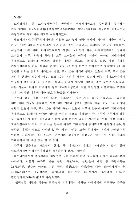 81 5.결론 도시생태계 중 도시녹지공간이 공급하는 생태계서비스에 주민들이 부여하는 편익 가치 를 헤도닉가격법/주택특성가격법 HPM 과 선택실험 CE 을 적용하여 실증적으로 측정하고자 하고 이를 지도로 시각화하였다. 헤도닉가격법/주택특성가격법을 적용한 도시녹지 연구 결과에 의하면, 서울의 경우, 가장 근접한 3개의 아파트단지 평균 가격, 층수, 건축년도, 총세대수, 가구당 주차대수, 시공순위 10위 이내, 아파트단지에서 산림이 보이는지 여부, 아파트단지에서 공원이 보이는지 여부, 하천과 공원이 모두 보이는지 여부가 서울시 아파트 거래가격에 통계적으로 유의하게 양 + 의 영향을 미치는 것으로 나타났다. 또한, 가장 가까운 편의시설까지의 거리, 산림과 공원이 모두 보이는지 여부는 통계적으로 유의하게 음 의 영향...