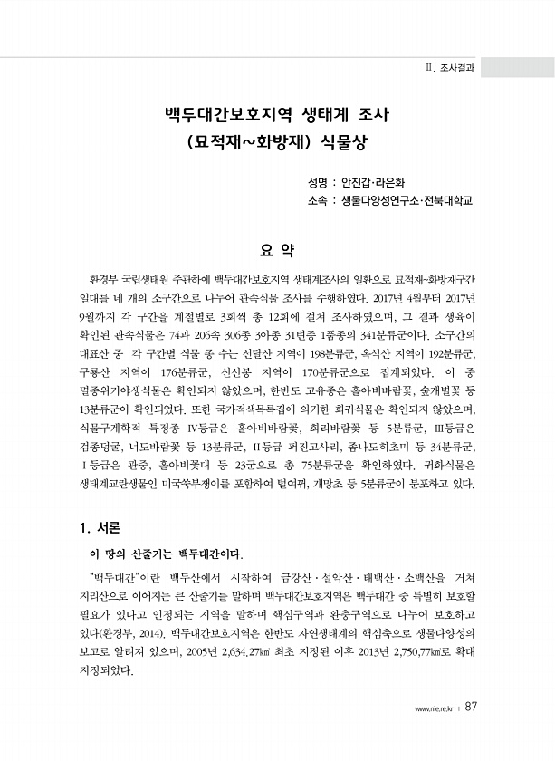 Ⅱ. 조사결과 www.nie.re.kr ? 87 백두대간보호지역 생태계 조사 묘적재화방재 식물상 성명 안진갑·라은화 소속 생물다양성연구소·전북대학교 요 약 환경부 국립생태원 주관하에 백두대간보호지역 생태계조사의 일환으로 묘적재화방재구간 일대를 네 개의 소구간으로 나누어 관속식물 조사를 수행하였다. 2017년 4월부터 2017년 9월까지 각 구간을 계절별로 3회씩 총 12회에 걸쳐 조사하였으며, 그 결과 생육이 확인된 관속식물은 74과 206속 306종 3아종 31변종 1품종의 341분류군이다. 소구간의 대표산 중 각 구간별 식물 종 수는 선달산 지역이 198분류군, 옥석산 지역이 192분류군, 구룡산 지역이 176분류군, 신선봉 지역이 170분류군으로 집계되었다. 이 중 멸종위기야생식물은 확인되지 않았으며,...