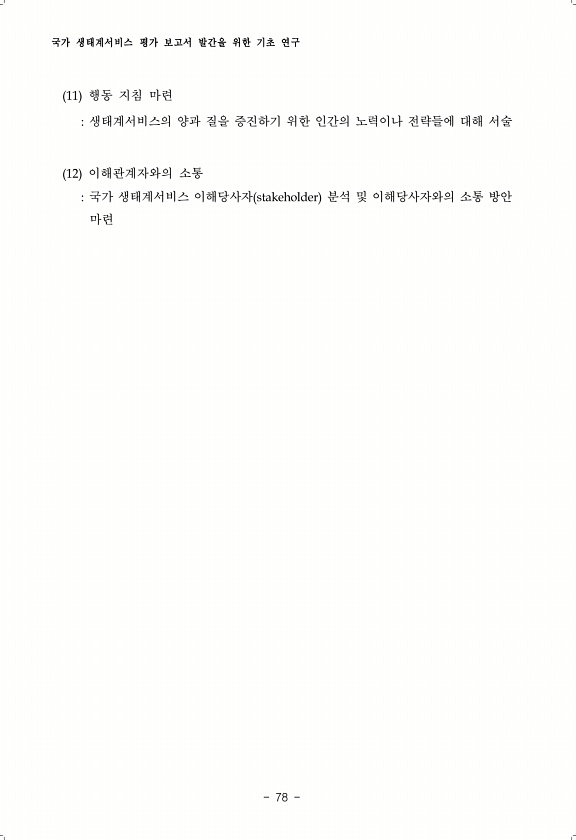 국가 생태계서비스 평가 보고서 발간을 위한 기초 연구 78 11 행동 지침 마련 생태계서비스의 양과 질을 증진하기 위한 인간의 노력이나 전략들에 대해 서술 12 이해관계자와의 소통 국가 생태계서비스 이해당사자 stakeholder 분석 및 이해당사자와의 소통 방안마련