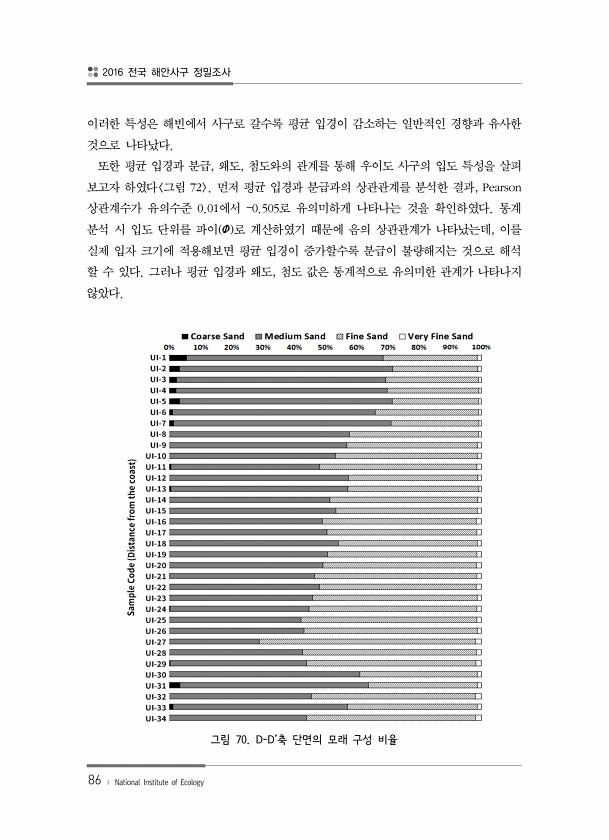 2016 전국 해안사구 정밀조사 86 ? National Institute of Ecology 이러한 특성은 해빈에서 사구로 갈수록 평균 입경이 감소하는 일반적인 경향과 유사한 것으로 나타났다. 또한 평균 입경과 분급, 왜도, 첨도와의 관계를 통해 우이도 사구의 입도 특성을 살펴 보고자 하였다 그림 72 먼저 평균 입경과 분급과의 상관관계를 분석한 결과, Pearson 상관계수가 유의수준 0.01에서 ?0.505로 유의미하게 나타나는 것을 확인하였다. 통계 분석 시 입도 단위를 파이 Φ 로 계산하였기 때문에 음의 상관관계가 나타났는데, 이를 실제 입자 크기에 적용해보면 평균 입경이 증가할수록 분급이 불량해지는 것으로 해석 할 수 있다. 그러나 평균 입경과 왜도, 첨도 값은 통계적으로 유의미한 관계가 나타나지...