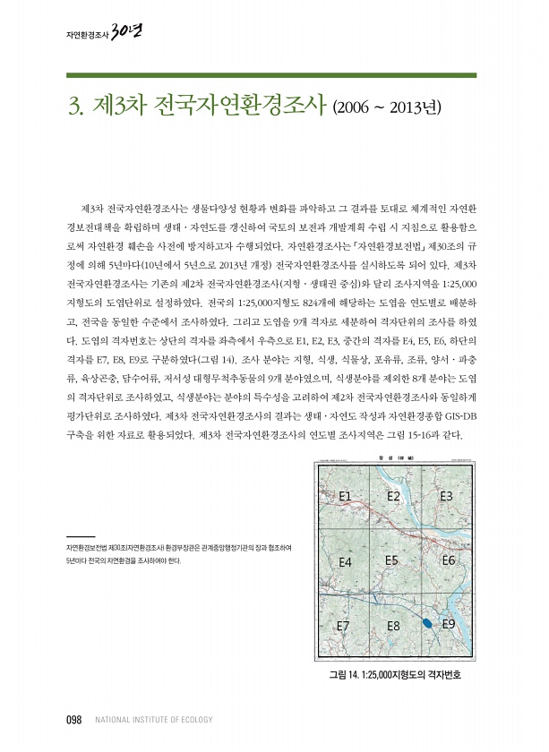 3. 제3차 전국자연환경조사 2006 ~ 2013년 제3차 전국자연환경조사는 생물다양성 현황과 변화를 파악하고 그 결과를 토대로 체계적인 자연환 경보전대책을 확립하며 생태 · 자연도를 갱신하여 국토의 보전과 개발계획 수립 시 지침으로 활용함으 로써 자연환경 훼손을 사전에 방지하고자 수행되었다. 자연환경조사는 「자연환경보전법」 제30조의 규 정에 의해 5년마다 10년에서 5년으로 2013년 개정 전국자연환경조사를 실시하도록 되어 있다. 제3차 전국자연환경조사는 기존의 제2차 전국자연환경조사 지형 · 생태권 중심 와 달리 조사지역을 125,000 지형도의 도엽단위로 설정하였다. 전국의 125,000지형도 824개에 해당하는 도엽을 연도별로 배분하 고, 전국을 동일한 수준에서 조사하였다. 그리고 도엽을 9개 격자...