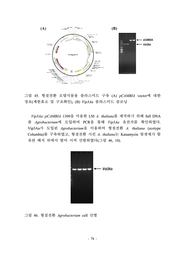 74 그림 45. 형질전환 모델식물용 플라스미드 구축 A pCAMBIA vector에 대한 정보 제한효소 및 구조확인 , B Vip3Aa 플라스미드 클로닝 Vip3AapCAMBIA 1300을 이용한 LM A. thaliana를 제작하기 위해 full DNA 를 Agrobacterium에 도입하여 PCR을 통해 Vip3Aa 유전자를 확인하였다. Vip3Aa가 도입된 Agrobacterium을 이용하여 형질전환 A. thaliana ecotype Columbia 를 구축하였고, 형질전환 시킨 A. thaliana는 Kanamycin 항생제가 함 유된 배지 위에서 발아 시켜 선발하였다 그림 46, 10 그림 46. 형질전환 Agrobacterium cell선별
