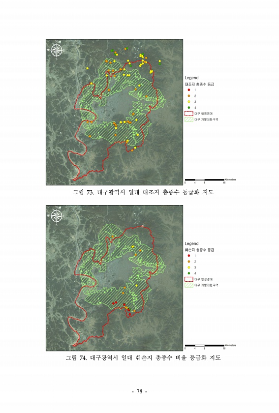 그림 73. 대구광역시 일대 대조지 총종수 등급화 지도 그림 74. 대구광역시 일대 훼손지 총종수 비율 등급화 지도 78