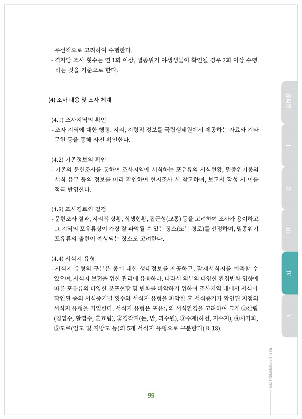 99 제5차 전국자연환경조사 지침 우선적으로?고려하여?수행한다. 격자당?조사?횟수는?연 ?회?이상, 멸종위기?야생생물이?확인될?경우 ?회?이상?수행 하는?것을?기준으로?한다. 4 조사?내용?및?조사?체계 ?.? 조사지역의?확인 조사?지역에?대한?행정, 지리, 지형적?정보를?국립생태원에서?제공하는?자료와?기타 문헌?등을?통해?사전?확인한다. ?.? 기존정보의?확인 기존의?문헌조사를?통하여?조사지역에?서식하는?포유류의?서식현황, 멸종위기종의 서식?유무?등의?정보를?미리?확인하여?현지조사?시?참고하며, 보고서?작성?시?이를 적극?반영한다. ?.? 조사경로의?결정 문헌조사?결과, 지리적?상황, 식생현황, 접근성 교통 등을?고려하여?조사가?용이하고 그?지역의?포유류상이?가장?잘?파악될?수?있는?장소 또는?경로 를?선...