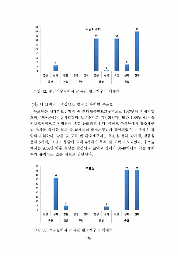70 그림 32. 주남저수지에서 조사된 황소개구리 개체수 카 제 11지역 경상남도 창녕군 유어면 우포늪 우포늪은 생태계보전지역 중 생태계특별보호구역으로 1997년에 지정되었 으며, 1998년에는 람사르협약 보존습지로 지정되었다. 또한 1999년에는 습 지보호지역으로 지정되어 보호 관리되고 있다. 금년도 우포늪에서 황소개구 리 조사를 실시한 결과 총 46개체의 황소개구리가 확인되었으며, 유생은 확 인되지 않았다. 발견 및 포획 된 황소개구리는 목견을 통해 37개체, 청음을 통해 5개체, 그리고 통발에 의해 4개체가 목격 및 포획 조사되었다. 우포늪 에서는 2014년 이후 유생은 발견되지 않았고 성체가 30-40개체로 적은 개체 수가 유지되고 있는 것으로 판단된다. 그림 33. 우포늪에서 조사된 황소개구리개체수