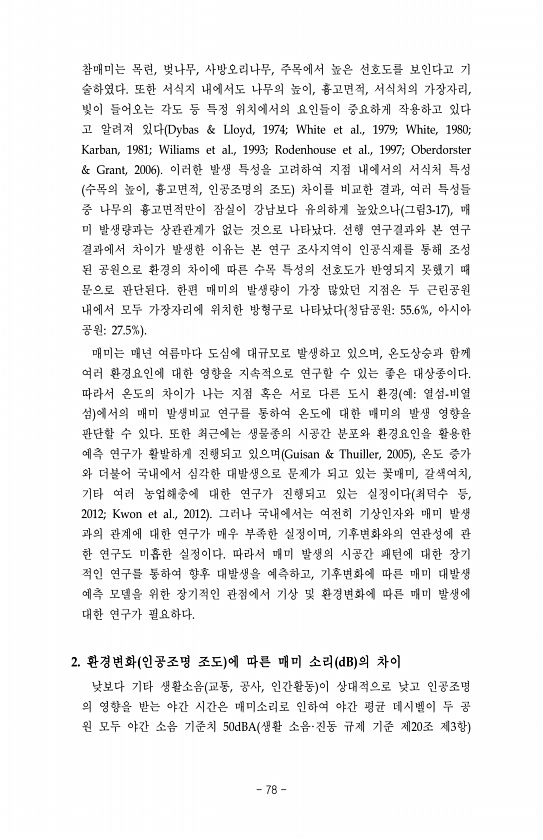 참매미는 목련, 벚나무, 사방오리나무, 주목에서 높은 선호도를 보인다고 기 술하였다. 또한 서식지 내에서도 나무의 높이, 흉고면적, 서식처의 가장자리, 빛이 들어오는 각도 등 특정 위치에서의 요인들이 중요하게 작용하고 있다 고 알려져 있다 Dybas & Lloyd, 1974; White et al., 1979; White, 1980; Karban, 1981; Wiliams et al., 1993; Rodenhouse et al., 1997; Oberdorster & Grant, 2006 이러한 발생 특성을 고려하여 지점 내에서의 서식처 특성 수목의 높이, 흉고면적, 인공조명의 조도 차이를 비교한 결과, 여러 특성들 중 나무의 흉고면적만이 잠실이 강남보다 유의하게 높았으나 그림3-17 , 매 미 발생량과는 상...