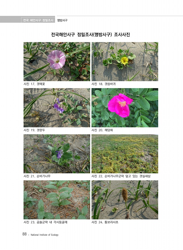 전국 해안사구 정밀조사 맹방사구 88 ? National Institute of Ecology 전국해안사구 정밀조사 맹방사구 조사사진 사진 17. 갯메꽃 사진 18. 갯씀바귀 사진 19. 갯완두 사진 20. 해당화 사진 21. 순비기나무 사진 22. 순비가나무군락 덮고 있는 갯실새삼 사진 23. 곰솔군락 내 각시둥굴레 사진 24.통보리사초