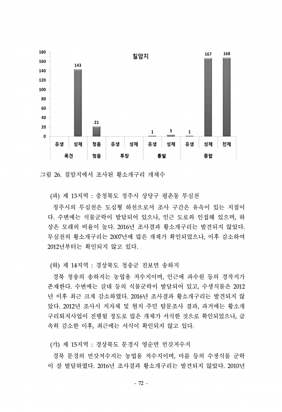 72 그림 26. 칠암지에서 조사된 황소개구리 개체수 파 제 13지역 충청북도 청주시 상당구 평촌동 무심천 청주시의 무심천은 도심형 하천으로서 조사 구간은 유속이 있는 지점이 다. 수변에는 식물군락이 발달되어 있으나, 인근 도로와 인접해 있으며, 하 상은 모래의 비율이 높다. 2016년 조사결과 황소개구리는 발견되지 않았다. 무심천의 황소개구리는 2007년에 많은 개체가 확인되었으나, 이후 감소하여 2012년부터는 확인되지 않고 있다. 하 제 14지역 경상북도 청송군 진보면 송하지 경북 청송의 송하지는 농업용 저수지이며, 인근에 과수원 등의 경작지가 존재한다. 수변에는 갈대 등의 식물군락이 발달되어 있고, 수생식물은 2012 년 이후 최근 크게 감소하였다. 2016년 조사결과 황소개구리는 발견되지 않 았다....