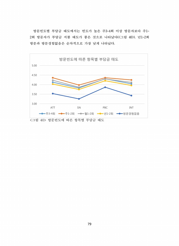 79 방문빈도별 부담금 태도에서는 빈도가 높은 주3-4회 이상 방문자보다 주1- 2회 방문자가 부담금 지불 태도가 좋은 것으로 나타났다 그림 40 년1-2회 방문과 방문경험없음은 순차적으로 가장 낮게 나타났다. 그림 40 방문빈도에 따른 항목별 부담금 태도 3.00 3.50 4.00 4.50 5.00 ATT SN PBC INT 방문빈도에 따른 항목별 부담금 태도 주3-4회 주1-2회 월1-2회 년1-2회방문경험없음