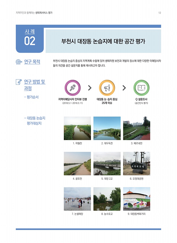 지역주민과 함께하는 생태계서비스 평가 12 사 례 02 부천시 대장동 논습지에 대한 공간 평가 부천시 대장동 논습지 중심의 지역계획 수립에 있어 생태자원 보전과 개발의 장소에 대한 다양한 이해당사자 들의 의견을 공간 설문지를 통해 제시하고자 합니다. 연구 목적 연구 방법 및 과정 평가순서 지역이해당사자 인터뷰 진행 2018.5.12018.5.11 대장동 논·습지 중심 25개 이슈 Q 설문조사 공간인식 평가 1. 여월천 2. 대두둑천 3. 베르네천 4. 굴포천 5. 대장 2교 6. 오정대공원 7. 논썰매장 8. 농수로교 9. 대장동벽화거리 대장동 논습지평가대상지