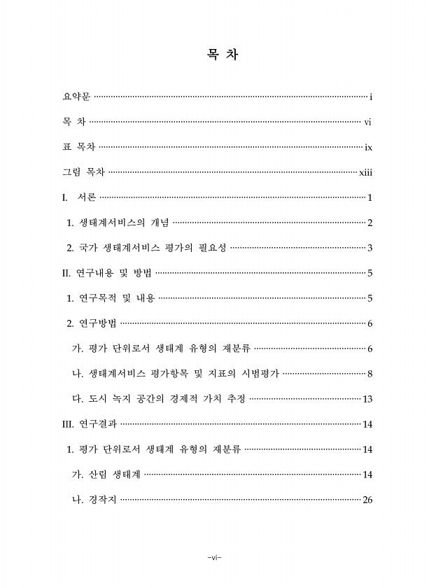 -vi- 목 차 요약문 목 차 표 목차 그림 목차 서론 생태계서비스의 개념 국가 생태계서비스 평가의 필요성 연구내용 및 방법 연구목적 및 내용 연구방법 가 평가 단위로서 생태계 유형의 재분류 나 생태계서비스 평가항목 및 지표의 시범평가 다 도시 녹지 공간의 경제적 가치 추정 연구결과 평가 단위로서 생태계 유형의 재분류 가 산림 생태계 나경작지