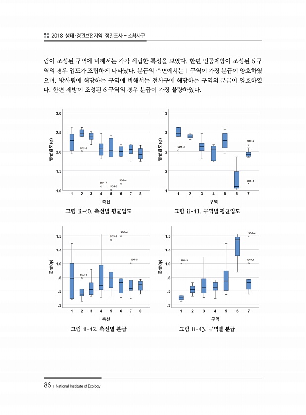 2018 생태·경관보전지역 정밀조사 소황사구 86 ? National Institute of Ecology 림이 조성된 구역에 비해서는 각각 세립한 특성을 보였다. 한편 인공제방이 조성된 6 구 역의 경우 입도가 조립하게 나타났다. 분급의 측면에서는 1 구역이 가장 분급이 양호하였 으며, 방사림에 해당하는 구역에 비해서는 전사구에 해당하는 구역의 분급이 양호하였 다. 한편 제방이 조성된 6 구역의 경우 분급이 가장 불량하였다. 그림 ⅱ-40. 측선별 평균입도 그림 ⅱ-41. 구역별 평균입도 그림 ⅱ-42. 측선별 분급 그림 ⅱ-43. 구역별분급