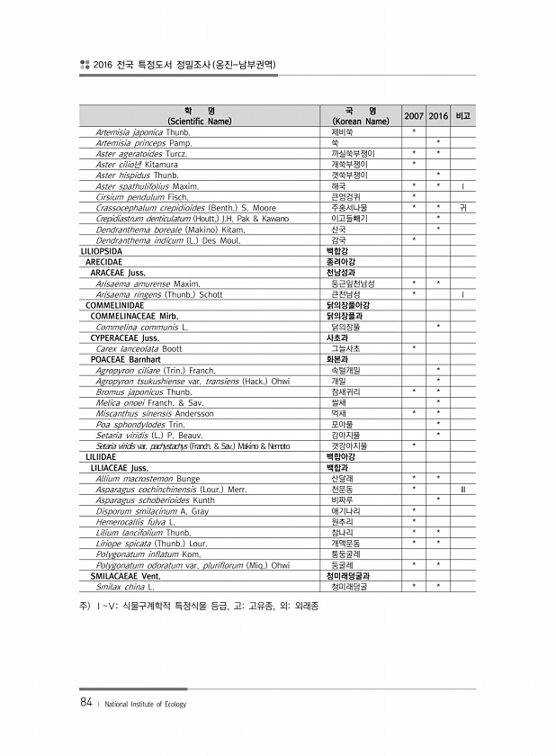 2016 전국 특정도서 정밀조사 옹진-남부권역 84 ? National Institute of Ecology 학 명 Scientific Name 국 명 Korean Name 2007 2016 비고 Artemisia japonica Thunb. 제비쑥 * Artemisia princeps Pamp. 쑥 * Aster ageratoides Turcz. 까실쑥부쟁이 * * Aster cilio년 Kitamura 개쑥부쟁이 * Aster hispidus Thunb. 갯쑥부쟁이 * Aster spathulifolius Maxim. 해국 * * Ⅰ Cirsium pendulum Fisch. 큰엉겅퀴 * Crassocephalum crepidioides Benth. S. Moore 주홍서나물 * * 귀 Crepidias...