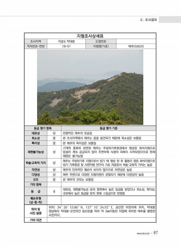 Ⅱ. 조사결과 www.nie.re.kr ? 87 지형조사상세표 조사지역 거금도 적대봉 도엽번호 격자번호-연번 18-01 지형명 기호 애추 GM20 등급 평가 항목 등급 평가 기준 대표성 상 전형적인 애추의 모습임 희소성 중 본 조사지역에서 애추는 종종 발견되기 때문에 희소성은 보통임 특이성 중 본 애추의 특이성은 보통임 재현불가능성 상 기계적 풍화와 관련된 애추는 주빙하기후환경에서 형성된 화석지형으로 암설이 계속 공급되지 않아 주변부에 식생의 피복이 시작되었으므로 현재 재현은 불가능함 학술?교육적 가치 상 애추는 주빙하기후 지형으로서 빙기 때 형성 된 후 활동이 멈춘 화석지형으로 빙기 기후환경 및 사면지형 연구의 기초 자료로서 학술·교육적 가치는 높음 자연성 상 애추의 인위적인 훼손이 보이지 않으므로 자연성...