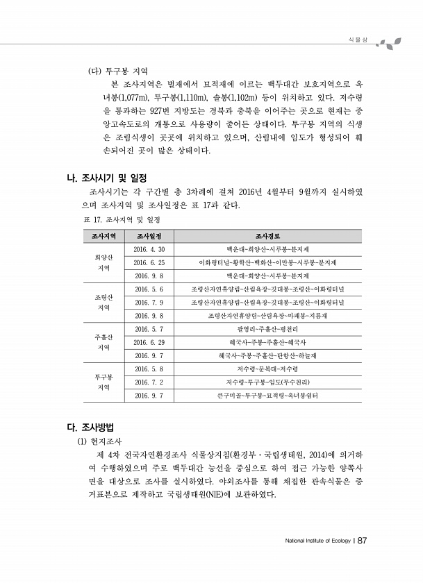 식 물 상 National Institute of EcologyⅠ87 다 투구봉 지역 본 조사지역은 벌재에서 묘적재에 이르는 백두대간 보호지역으로 옥 녀봉 1,077m , 투구봉 1,110m , 솔봉 1,102m 등이 위치하고 있다. 저수령 을 통과하는 927번 지방도는 경북과 충북을 이어주는 곳으로 현재는 중 앙고속도로의 개통으로 사용량이 줄어든 상태이다. 투구봉 지역의 식생 은 조림식생이 곳곳에 위치하고 있으며, 산림내에 임도가 형성되어 훼 손되어진 곳이 많은 상태이다. 나. 조사시기 및 일정 조사시기는 각 구간별 총 3차례에 걸쳐 2016년 4월부터 9월까지 실시하였 으며 조사지역 및 조사일정은 표 17과 같다. 조사지역 조사일정 조사경로 희양산 지역 2016. 4. 30 백운대희양산시루봉분지제 201...