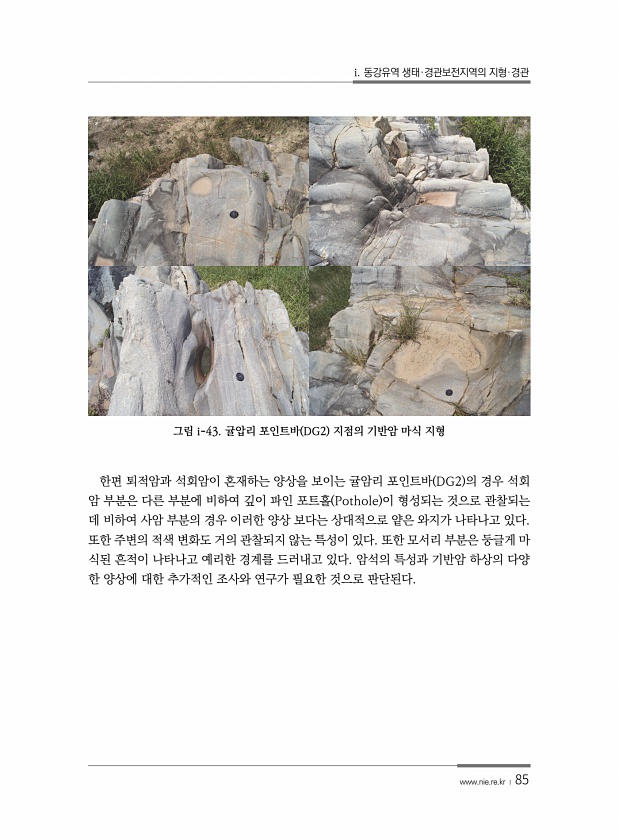 i. 동강유역 생태·경관보전지역의 지형·경관 www.nie.re.kr ? 85 그림 i-43. 귤압리 포인트바 DG2 지점의 기반암 마식 지형 한편 퇴적암과 석회암이 혼재하는 양상을 보이는 귤암리 포인트바 DG2 의 경우 석회 암 부분은 다른 부분에 비하여 깊이 파인 포트홀 Pothole 이 형성되는 것으로 관찰되는 데 비하여 사암 부분의 경우 이러한 양상 보다는 상대적으로 얕은 와지가 나타나고 있다. 또한 주변의 적색 변화도 거의 관찰되지 않는 특성이 있다. 또한 모서리 부분은 둥글게 마 식된 흔적이 나타나고 예리한 경계를 드러내고 있다. 암석의 특성과 기반암 하상의 다양 한 양상에 대한 추가적인 조사와 연구가 필요한 것으로판단된다.
