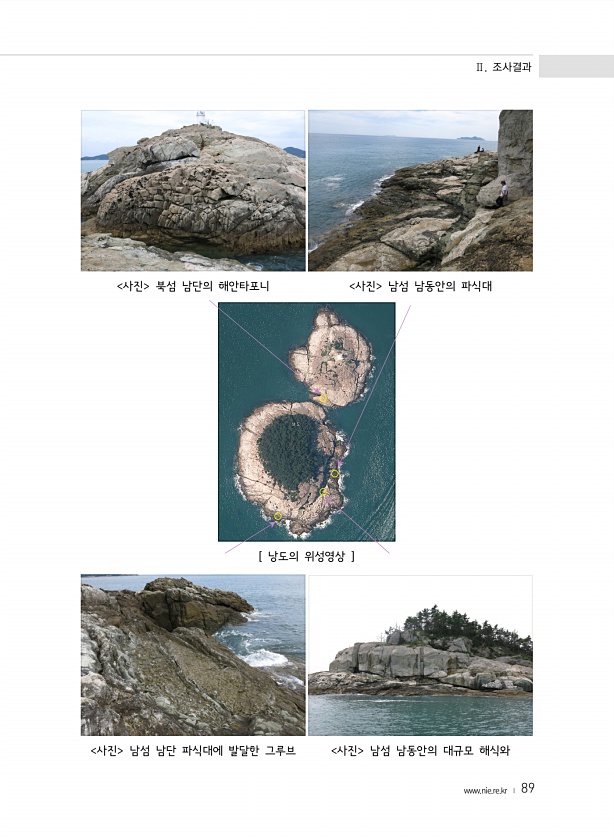 Ⅱ. 조사결과 www.nie.re.kr ? 89 [ 낭도의 위성영상 ] 사진 남섬 남동안의 대규모 해식와 사진 북섬 남단의 해안타포니 사진 남섬 남동안의 파식대 사진 남섬 남단 파식대에 발달한그루브