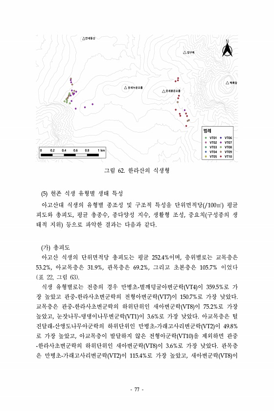 77 그림 62. 한라산의 식생형 5 현존 식생 유형별 생태 특성 아고산대 식생의 유형별 종조성 및 구조적 특성을 단위면적당 /100㎡ 평균 피도와 총피도, 평균 총종수, 종다양성 지수, 생활형 조성, 중요치 구성종의 생 태적 지위 등으로 파악한 결과는 다음과 같다. 가 총피도 아고산 식생의 단위면적당 총피도는 평균 252.4%이며, 층위별로는 교목층은 53.2%, 아교목층은 31.9%, 관목층은 69.2%, 그리고 초본층은 105.7% 이었다 표 22, 그림 63 식생 유형별로는 전층의 경우 만병초-벌깨덩굴아변군락 VT4 이 359.5%로 가 장 높았고 관중-한라사초변군락의 전형아변군락 VT7 이 150.7%로 가장 낮았다. 교목층은 관중-한라사초변군락의 하위단위인 새아변군락 VT8 이 75.2%로 가장 ...