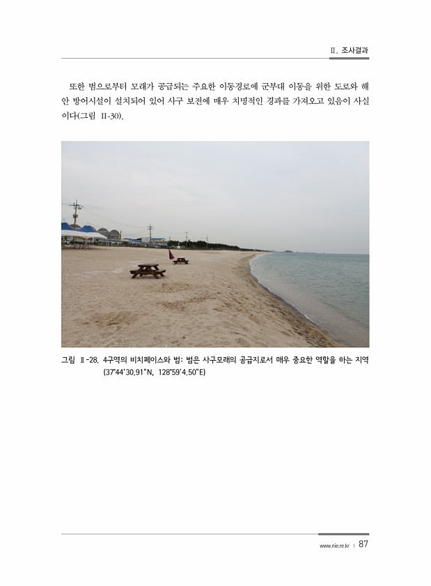 Ⅱ. 조사결과 www.nie.re.kr ? 87 또한 범으로부터 모래가 공급되는 주요한 이동경로에 군부대 이동을 위한 도로와 해 안 방어시설이 설치되어 있어 사구 보전에 매우 치명적인 경과를 가져오고 있음이 사실 이다 그림 Ⅱ-30 그림 Ⅱ-28. 4구역의 비치페이스와 범범은 사구모래의 공급지로서 매우 중요한 역할을 하는 지역 37°4430.91N, 128°594.50E