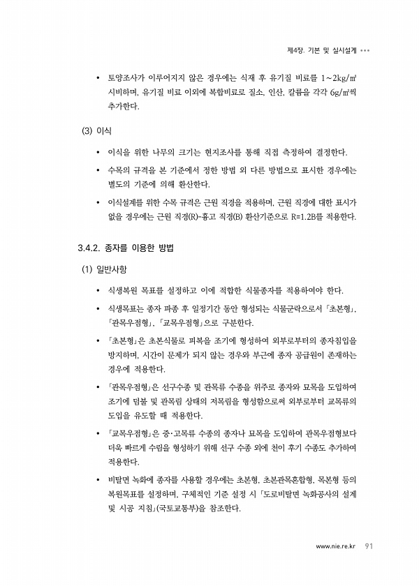 www.nie.re.kr 91 제4장. 기본 및 실시설계 토양조사가 이루어지지 않은 경우에는 식재 후 유기질 비료를 1∼2kg/㎡ 시비하며, 유기질 비료 이외에 복합비료로 질소, 인산, 칼륨을 각각 6g/㎡씩 추가한다. 3 이식 이식을 위한 나무의 크기는 현지조사를 통해 직접 측정하여 결정한다. 수목의 규격을 본 기준에서 정한 방법 외 다른 방법으로 표시한 경우에는 별도의 기준에 의해 환산한다. 이식설계를 위한 수목 규격은 근원 직경을 적용하며, 근원 직경에 대한 표시가 없을 경우에는 근원 직경 R -흉고 직경 B 환산기준으로 R=1.2B를 적용한다. 3.4.2. 종자를 이용한 방법 1 일반사항 식생복원 목표를 설정하고 이에 적합한 식물종자를 적용하여야 한다. 식생목표는 종자 파종 후 일정기간 동안 형성되는...