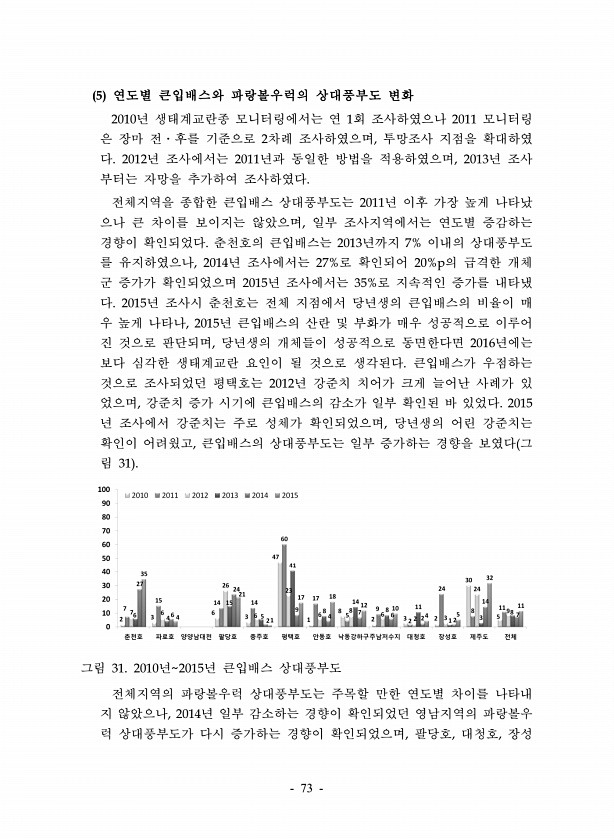 73 5 연도별 큰입배스와 파랑볼우럭의 상대풍부도 변화 2010년 생태계교란종 모니터링에서는 연 1회 조사하였으나 2011 모니터링 은 장마 전?후를 기준으로 2차례 조사하였으며, 투망조사 지점을 확대하였 다. 2012년 조사에서는 2011년과 동일한 방법을 적용하였으며, 2013년 조사 부터는 자망을 추가하여 조사하였다. 전체지역을 종합한 큰입배스 상대풍부도는 2011년 이후 가장 높게 나타났 으나 큰 차이를 보이지는 않았으며, 일부 조사지역에서는 연도별 증감하는 경향이 확인되었다. 춘천호의 큰입배스는 2013년까지 7% 이내의 상대풍부도 를 유지하였으나, 2014년 조사에서는 27%로 확인되어 20%p의 급격한 개체 군 증가가 확인되었으며 2015년 조사에서는 35%로 지속적인 증가를 내타냈 다. 201...