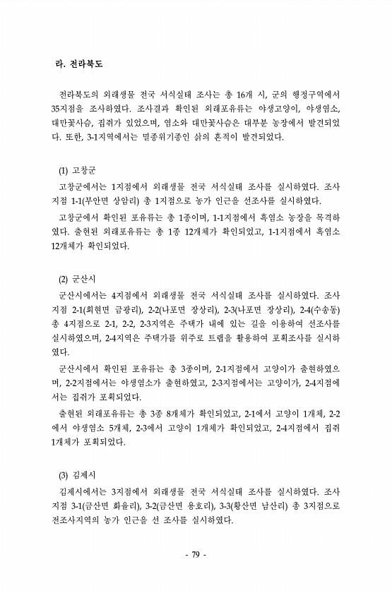 79 라. 전라북도 전라북도의 외래생물 전국 서식실태 조사는 총 16개 시, 군의 행정구역에서 35지점을 조사하였다. 조사결과 확인된 외래포유류는 야생고양이, 야생염소, 대만꽃사슴, 집쥐가 있었으며, 염소와 대만꽃사슴은 대부분 농장에서 발견되었 다. 또한, 3-1지역에서는 멸종위기종인 삵의 흔적이 발견되었다. 1 고창군 고창군에서는 1지점에서 외래생물 전국 서식실태 조사를 실시하였다. 조사 지점 1-1 부안면 상암리 총 1지점으로 농가 인근을 선조사를 실시하였다. 고창군에서 확인된 포유류는 총 1종이며, 1-1지점에서 흑염소 농장을 목격하 였다. 출현된 외래포유류는 총 1종 12개체가 확인되었고, 1-1지점에서 흑염소 12개체가 확인되었다. 2 군산시 군산시에서는 4지점에서 외래생물 전국 서식실태 조사를 실...