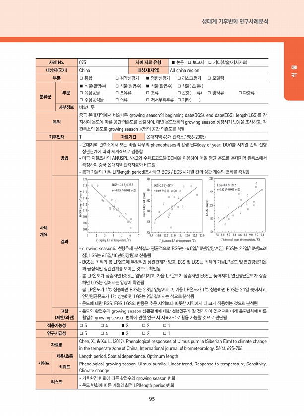 95 생태계 기후변화 연구사례분석 식 물 사례 No. 075 사례 자료 유형 ■ 논문 □ 보고서 □ 기타 학술/기사자료 대상지 국가 China 대상지 지역 All china region 부문 □ 통합 □ 취약성평가 ■ 영향성평가 □ 리스크평가 □ 모델링 분류군 부문 ■ 식물 활엽수 □ 식물 침엽수 ■ 식물 활엽수 □ 식물 초 본 □ 육상동물 □ 포유류 □ 조류 □ 곤충 류 □ 양서류 □ 파충류 □ 수상동식물 □ 어류 □ 저서무척추류 □ 기타 세부정보 비술나무 목적 중국 온대지역에서 비술나무 growing season의 beginning date BGS , end date EGS , length LGS 를 감 지하여 온도에 따른 공간 의존도를 산출하여, 매년 온도변화의 growing season 성장시기 반응...