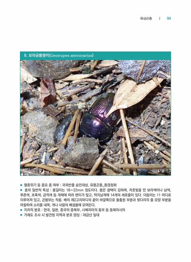 육상곤충 ┃ 99 9. 보라금풍뎅이 Geotrupes stercorarius ■ 멸종위기 등 중요 종 여부 국외반출 승인대상, 유용곤충_환경정화 ■ 종의 일반적 특성 몸길이는 18∼22mm 정도이다. 몸은 광택이 강하며, 자줏빛을 띤 보라색이나 남색, 푸른색, 초록색, 금적색 등 개체에 따라 변이가 많고, 딱지날개에 14개의 세로줄이 있다. 더듬이는 11 마디로 이루어져 있고, 곤붕부는 작음. 배의 제2고리마디의 끝이 바깥쪽으로 돌출된 부분과 뒷다리의 줄 모양 부분을 마찰하여 소리를 내며, 개나 사람의 배설물에 모여든다. ■ 지리적 분포 한국, 일본, 중국의 중북부, 시베리아의 동부 등 동북아시아 ■ 거제도 조사 시 발견된 지역과 분포 양상 대금산일대