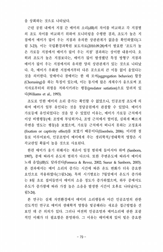 을 상회하는 것으로 나타났다. 근린 공원 내에서 지점 간 매미의 소리 dB 의 차이를 비교하고 각 지점별 의 조도 차이를 비교하기 위하여 모니터링을 수행한 결과, 조도가 높은 지 점에서 매미가 많이 우는 지점과 유의한 상관관계가 없음을 확인하였다 그 림 3-23 이는 국립환경과학원 보도자료 2010.09.28 에서 발표한 ‘조도가 높 은 가로등 지점에서 매미가 많이 우는 지점’ 결과와는 상이한 내용이다. 오 히려 조도가 높은 지점보다는, 매미가 많이 발생했던 특정 방형구 지점과 매미가 많이 우는 지점에서의 유의한 양의 상관관계가 있는 것으로 나타났 다. 즉, 매미가 우화한 지점에서부터 다른 곳으로의 큰 이동 없이 울었다는 것을 의미한다. 말매미나 참매미는 한 데 모여 aggregation behavior 합...