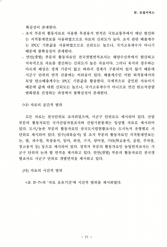 Ⅳ. 조절서비스 71 확실성이 존재한다. 초지 부문의 활동자료로 사용한 목장용지 면적은 국토교통부에서 매년 발간하 는 지적통계연보를 사용하였으므로 자료의 신뢰도가 높다. 초지 관련 배출계수 는 IPCC 기본값을 사용하였으므로 신뢰도는 높으나, 국가고유계수가 아니기 때문에 불확실성이 존재한다. 연안 갯벌 부문의 활동자료인 전국갯벌면적조사는 해양수산부에서 발간하고 지속적으로 자료를 갱신하는 신뢰도가 높은 자료이다. 그러나 육지의 경우와는 다르게 해상은 경계 기준이 없고 따라서 경계가 구분되어 있지 않기 때문에 시군구 단위의 면적 산출에는 어려움이 있다. 배출계수인 이탄 퇴적물에서의 토양 탄소배출계수는 IPCC 기본값을 활용한다. 국제적으로 공인된 자료이기 때문에 값에 대한 신뢰도는 높으나, 국가고유계수가 아니므...
