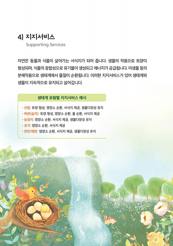 자연은 동물과 식물이 살아가는 서식지가 되어 줍니다. 생물의 작용으로 토양이 형성되며, 식물의 광합성으로 유기물이 생성되고 에너지가 공급됩니다. 미생물 등의 분해작용으로 생태계에서 물질이 순환됩니다. 이러한 지지서비스가 있어 생태계와 생물이 지속적으로 유지되고 살아갑니다. ?산림토양 형성, 영양소 순환, 서식지 제공, 생물다양성 유지 ?하천 습지 토양 형성, 영양소 순환, 물 순환, 서식지 제공 ?농경지영양소 순환, 서식지 제공, 생물다양성 유지 ?초지영양소 순환, 서식지 제공 ?연안/해양영양소 순환, 서식지 제공, 생물다양성 유지 4 지지서비스 Supporting Services 생태계 유형별 지지서비스 예시12