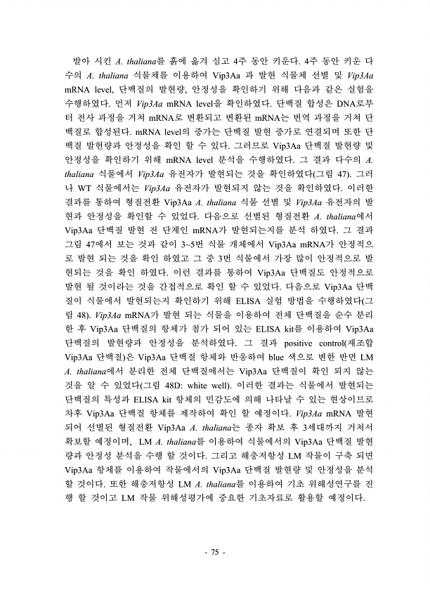 75 발아 시킨 A. thaliana를 흙에 옮겨 심고 4주 동안 키운다. 4주 동안 키운 다 수의 A. thaliana 식물체를 이용하여 Vip3Aa 과 발현 식물체 선별 및 Vip3Aa mRNA level, 단백질의 발현량, 안정성을 확인하기 위해 다음과 같은 실험을 수행하였다. 먼저 Vip3Aa mRNA level을 확인하였다. 단백질 합성은 DNA로부 터 전사 과정을 거쳐 mRNA로 변환되고 변환된 mRNA는 번역 과정을 거쳐 단 백질로 합성된다. mRNA level의 증가는 단백질 발현 증가로 연결되며 또한 단 백질 발현량과 안정성을 확인 할 수 있다. 그러므로 Vip3Aa 단백질 발현량 및 안정성을 확인하기 위해 mRNA level 분석을 수행하였다. 그 결과 다수의 A. thaliana 식물에서...